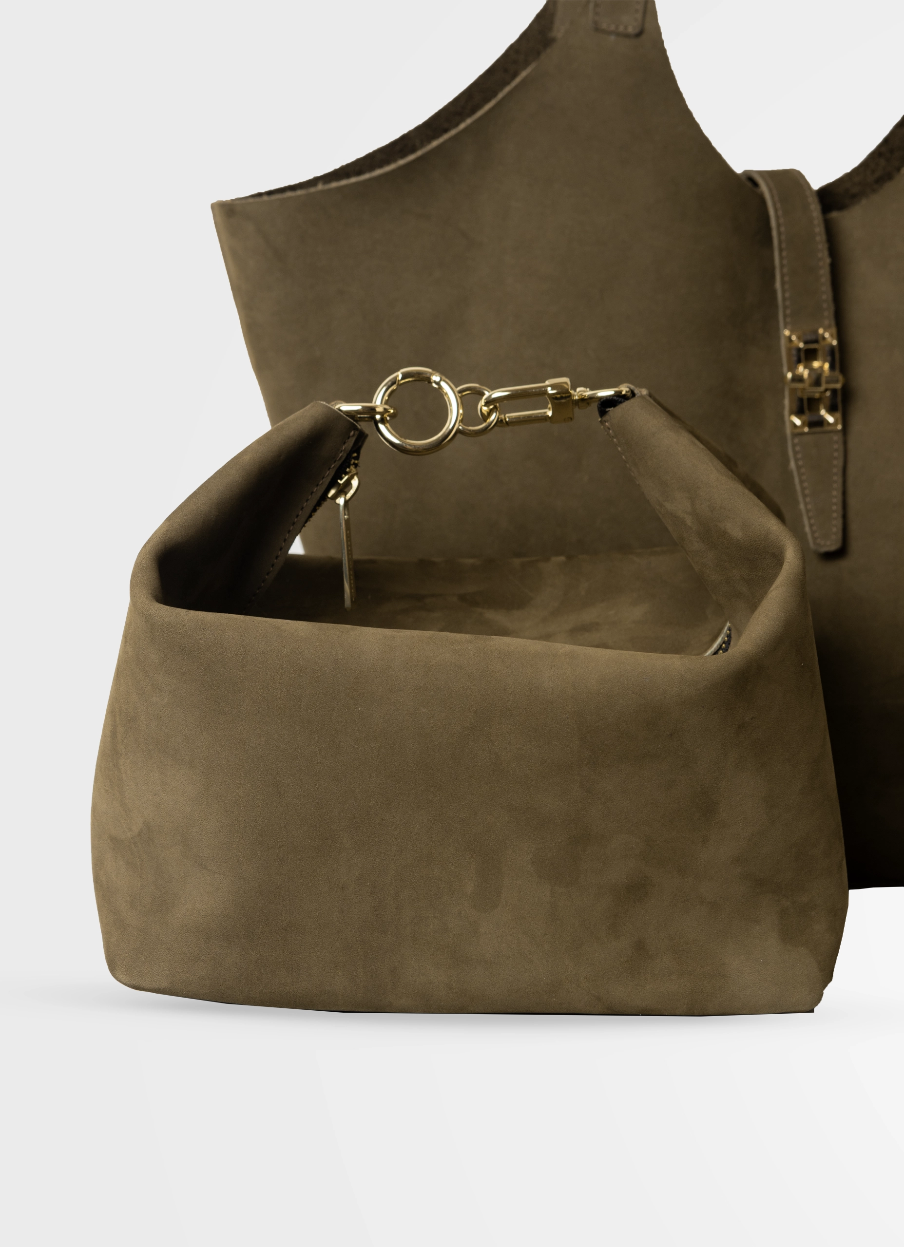 This versatile tote bag transforms into four different shapes to suit any time of day. Its spacious silhouette offers room and comfort, while the zippered inner pouch can be used independently. It includes two interchangeable straps for carrying it over the shoulder or across your body, combining functionality and sophistication in a single piece.