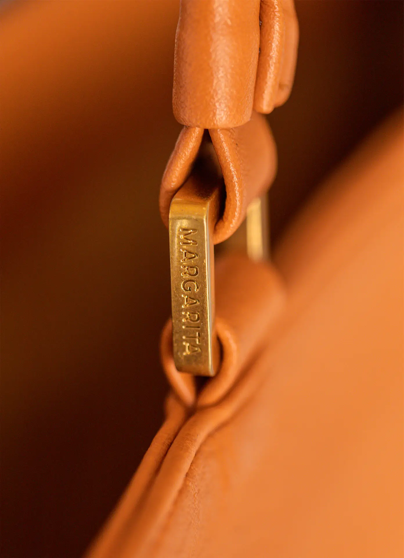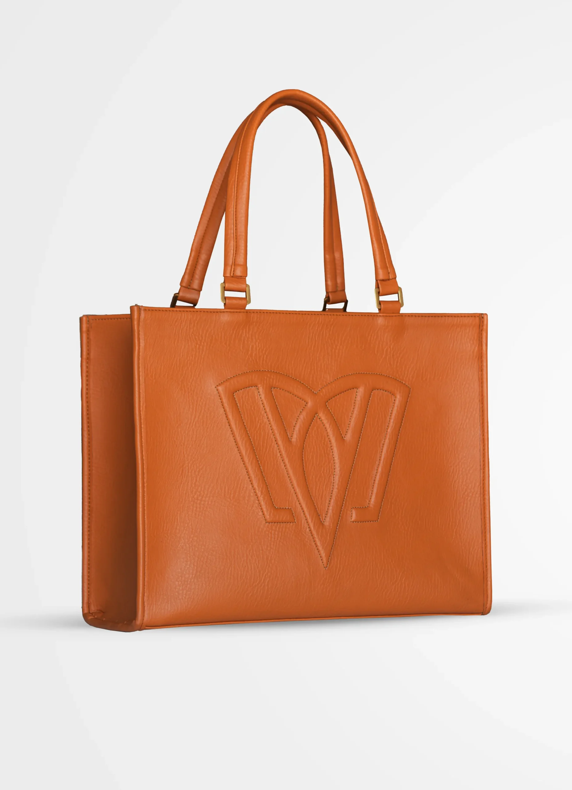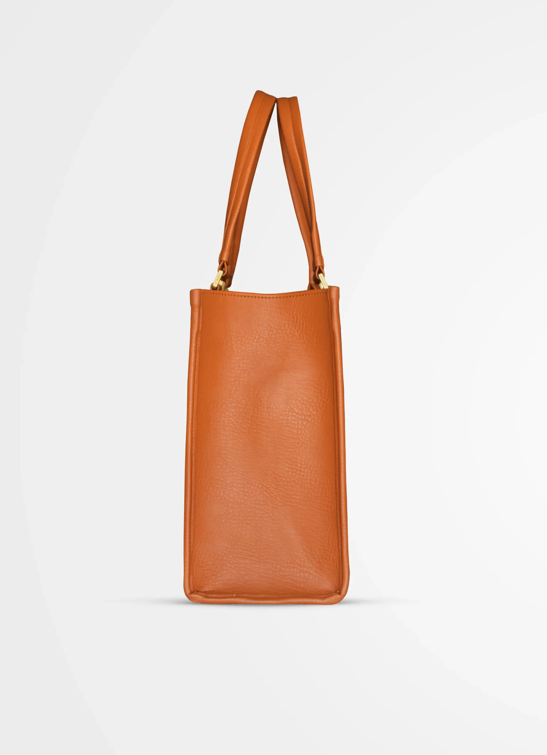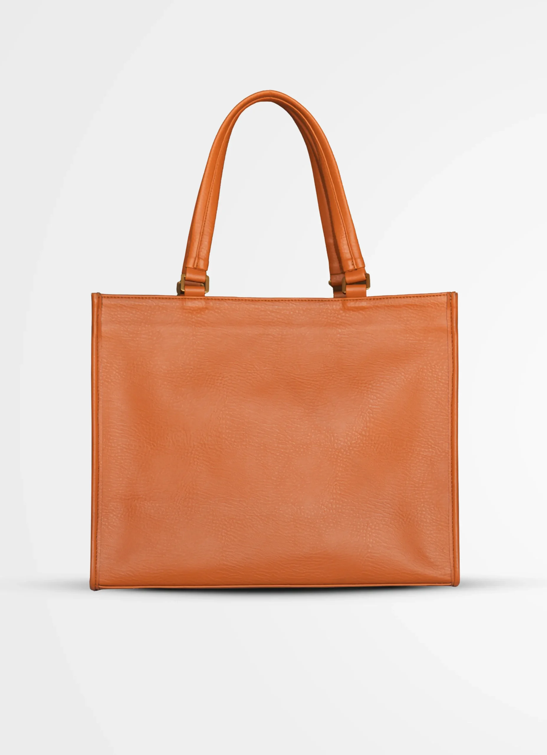 This bag is made from high-quality vegan leather. Its structured design features an embossed logo on the front, sturdy handles, and a spacious interior, perfect for carrying everything you need for your daily routine.