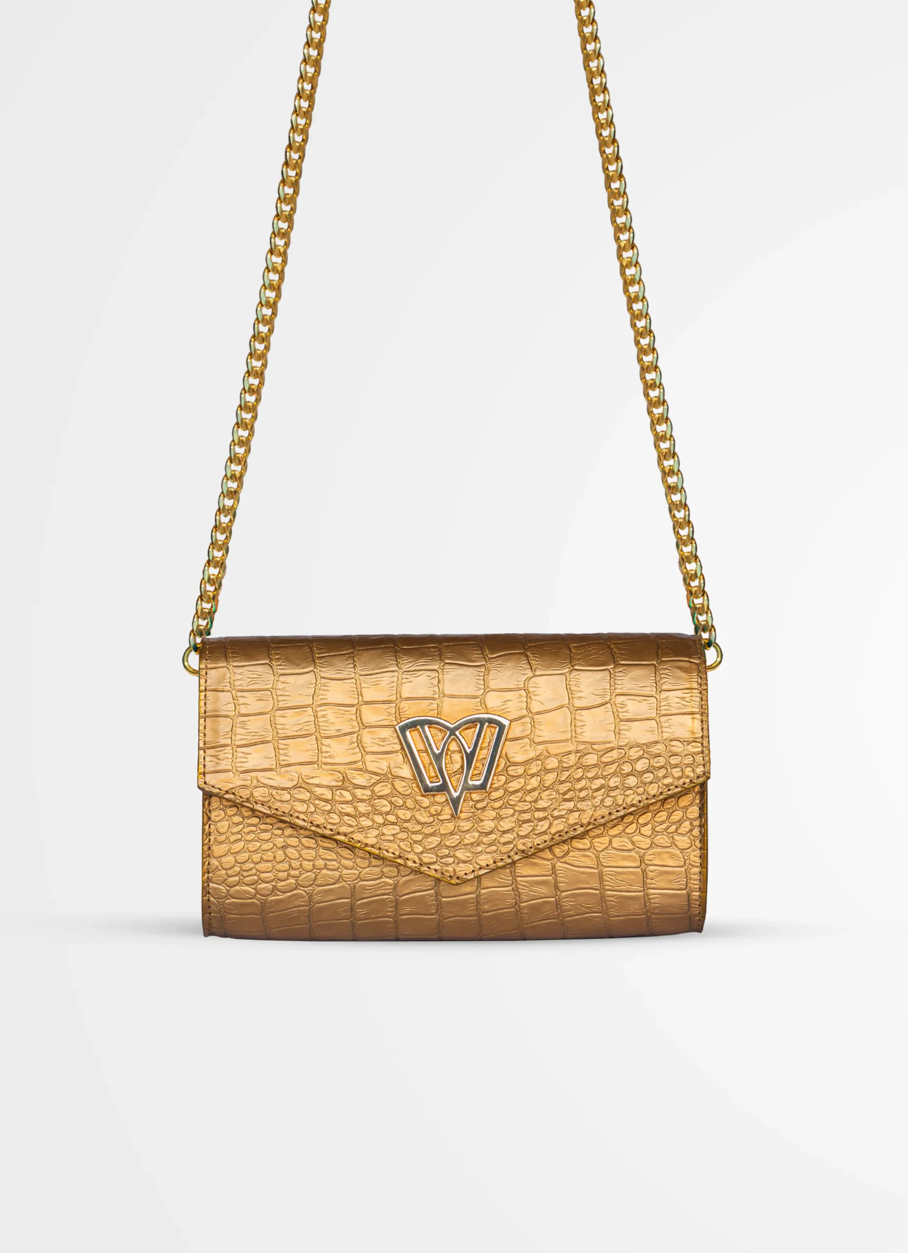 Un clutch tradicional con un toque moderno, elaborado utilizando cueros de alta calidad, embosados con textura de cocodrilo. Posee una cadena para usarlo como crossbody.