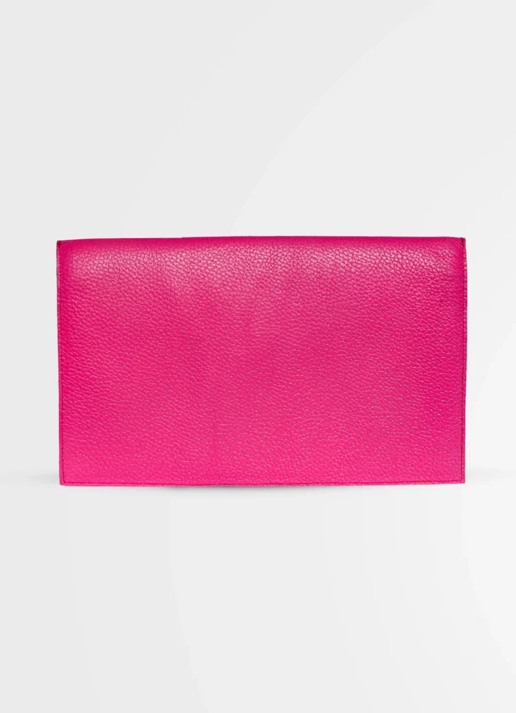 Un clutch tradicional con un toque moderno, elaborado utilizando cueros de alta calidad. Posee una cadena para usarlo como crossbody.